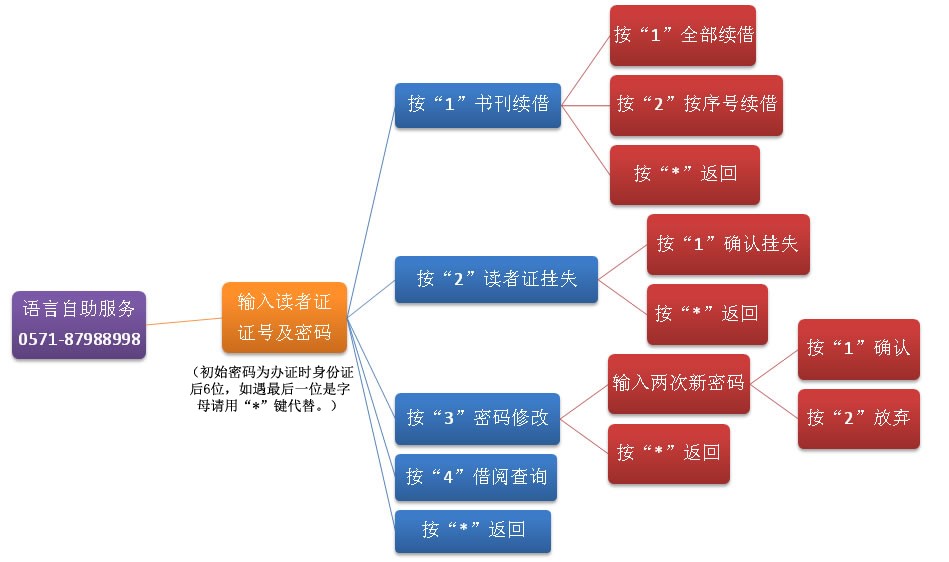 Service Description: “Zhejiang Library Telephony Service System” is a convenient, efficient service measure provided by Zhejiang Library by making full use of modern technologies for the purpose of further expanding channels for information communication with readers. At present, “Zhejiang Library Telephony Service System” provides four functions: renewal of books, reporting loss of reader’s card, modifying of password, and borrowing inquiry. How to call: Readers can enter Zhejiang Library Telephony Service System to enjoy a series of relevant services offered by Zhejiang Library by calling 0571-87988998 by fixed-line telephone or mobile phone. About charges: For calling “Zhejiang Library Telephony Service System”, readers only need to pay their operator communication expenses for we don’t charge for any service. Service time: automatic voice service is twenty four seven. Inquiries: 0571-87988338 Service Map: