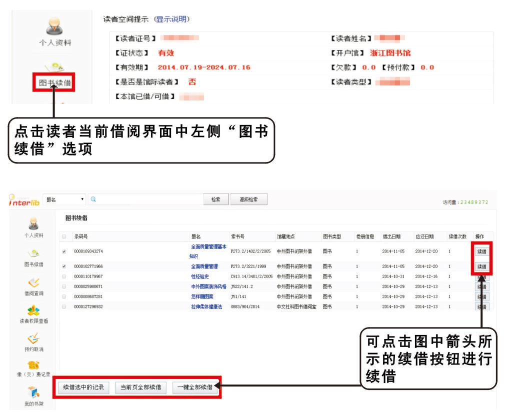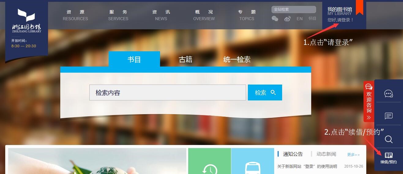 ① Readers can renew online on homepage of official website of Zhejiang Library.