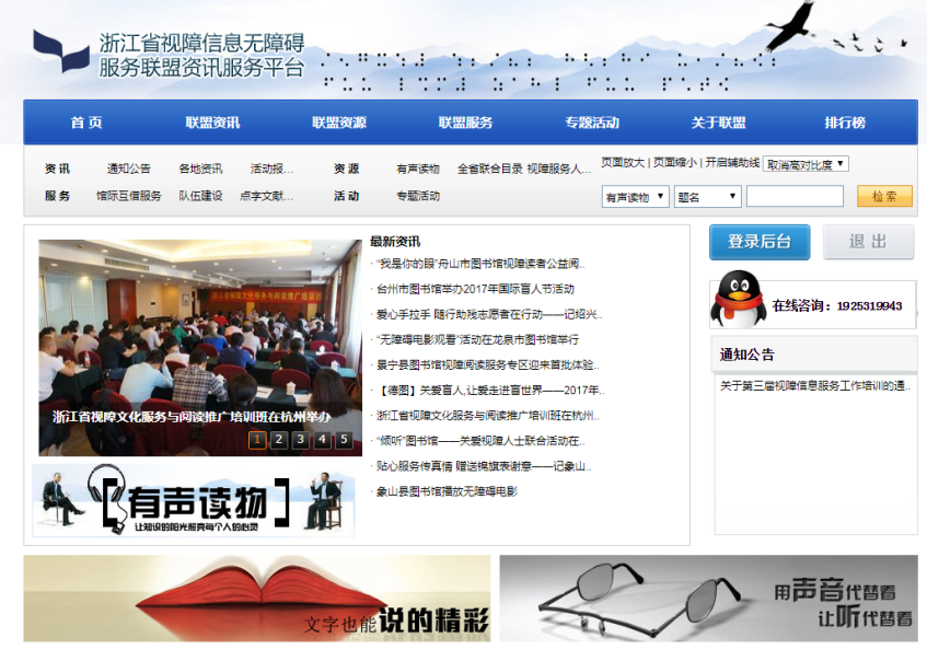 By far, the Service Center for the Visual Impaired has more than 1,000 readers with library cards, serving more than 60,000 readers. In 2012, Zhejiang Library, Disabled Persons' Federation, Association for the Blind, the Special Education School, and other public libraries in the province jointly developed the Zhejiang Information Accessibility Service Alliance for the Visual Impaired. In 2014, the alliance platform was launched, making Zhejiang Library’s blind resources accessible to the visually impaired across the province, and promoting the information accessibility service of Zhejiang Province.