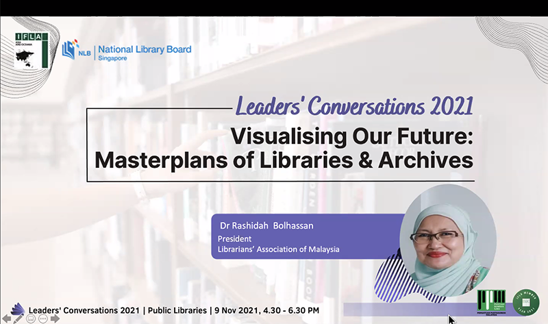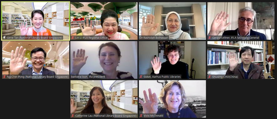 Leaders’ Conversations for the Public Libraries was held on 9 Nov 2021, SGT4.30pm – 6.30pm on Zoom. Barbara Lison, IFLA President , Gerald Leitner, IFLA Secretary General , Sidsel Bech-Petersen, Head of Innovation and Co-creation, Aarhus Public Libraries, Dr Rashidah Bolhassan, President, Librarians’ Association of Malaysia, Ng Cher Pong, Chief Executive Officer, National Library Board, Singapore attended the meeting. Vicki McDonald, State Librarian and CEO, State Library Queensland, Chu Shuqing, Director and Professor of Library Science, Zhejiang Library and Catherine Lau, Assistant Chief Executive, Archives & Libraries Group, National Library Board, Singapore was also present as special guests. They had a lively discussion on the current situation and future development plans of the library under the epidemic situation.