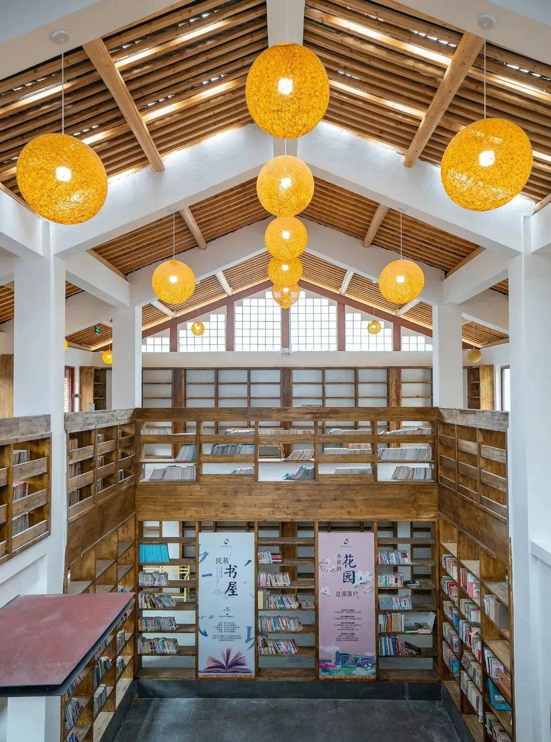 Built in 2020, the Dajun Branch of Jingning She Autonomous County Library serves as a cultural embodiment of the She people. The decoration of the building absorbs the characteristics of local residences. From shelves to desks, every detail is decorated with ribbons made by the She people. The ceiling lamp is made of bamboo strips. The She handicrafts are displayed in the cultural and creative center of the library, while walls, roofs, tables and chairs, windows all reflect the distinctive characteristics of local culture.