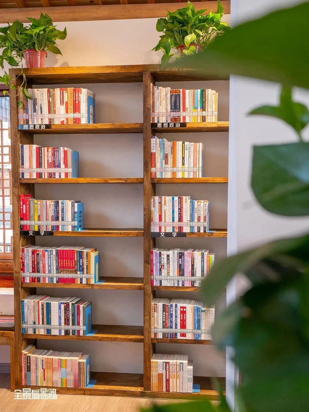 Besides , this library serves also as a haven of nature. The wooden structure, the green plants and the decorative stones enveloping the library create a tranquil space for readers to relax and to enjoy reading as well.
