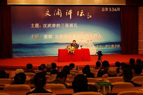 11月4日下午,浙图二楼报告厅座无虚席。第536期文澜讲坛邀请了百家讲坛最年轻的讲演者、著名史学家朱维铮先生最年轻的关门弟子——复旦大学历史系讲师姜鹏博士,为近500名听众作了一场题为“汉武帝的三张面孔”的讲座。