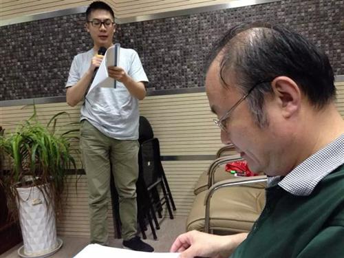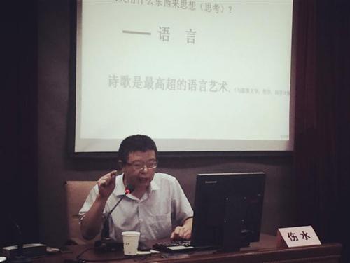 因此,诗人似乎被赋予了一种特权:可以且应当创造语言。伤水老师说,诗人的笔下简洁而强有力的文字,正是一个时代的最强音,诗人就是时代语言的创造人。他还拿一个有趣的例子展现诗歌的魅力与影响力:前些日子诗人北岛来杭,临走那晚,伤水老师陪他去杭州著名面馆——奎元馆,因航班起飞在即,时间紧迫,伤水老师希望服务员能先为他们上两碗面,服务员冷漠的拒绝,这时面馆的大厨过来,看着北岛,只说了一句“卑鄙是卑鄙者的通行证, 高尚是高尚者的墓志铭”便走进了厨房,不出两分钟,热腾腾的面就端上桌了。让人不禁感叹诗歌对一代人的影响,或许,北岛对于80后,90后的我们来说是陌生的,但他的诗却是上一代人实实在在的精神寄托,是留在他们心中无法淡忘的深刻回忆。,新时期以来,除了北岛以外的顾城、张枣、梁晓明、南野、昌耀等都对诗歌语言有着明显的贡献,为了更生动的展示诗歌的语言魅力,讲座中还特别邀请了文澜朗诵团团员傅家骧、傅博涵父子朗诵了二十多首现代汉诗代表性诗人的诗歌,让我们感受了这些当代诗人的不同语言特性,也让我们看到了诗人在不同时期多元化的文字倾述。诗歌的无用之用,却恰是诗人最真实最深刻的生命体验,诗人无愧是语言艺术的发明者和人性事物的发现者,无愧是现实生存的无畏者和自由意识的先锋战士。