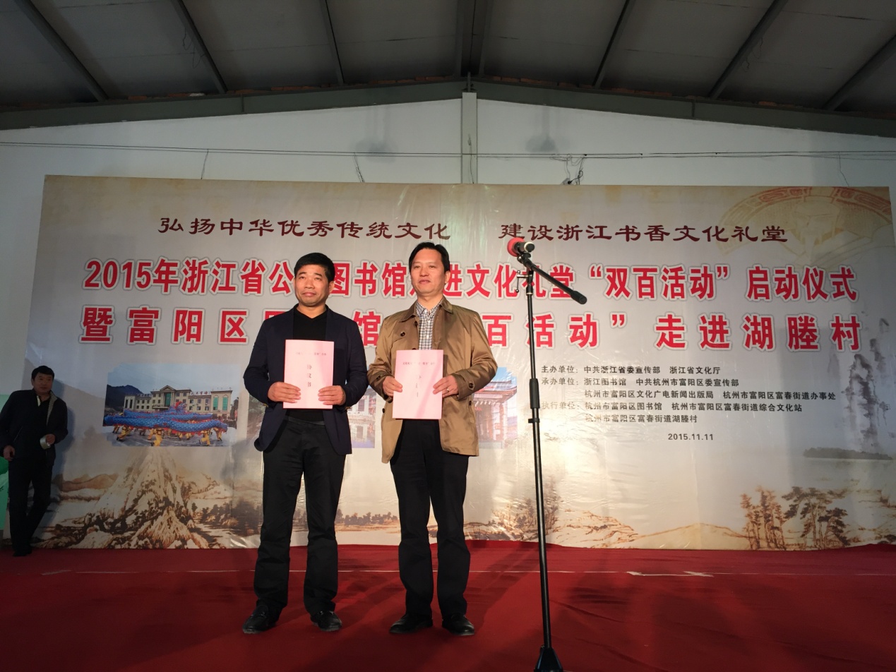 杭州市富阳区图书馆与富春街道湖塍村建立文化礼堂一对一服务及赠书仪式。