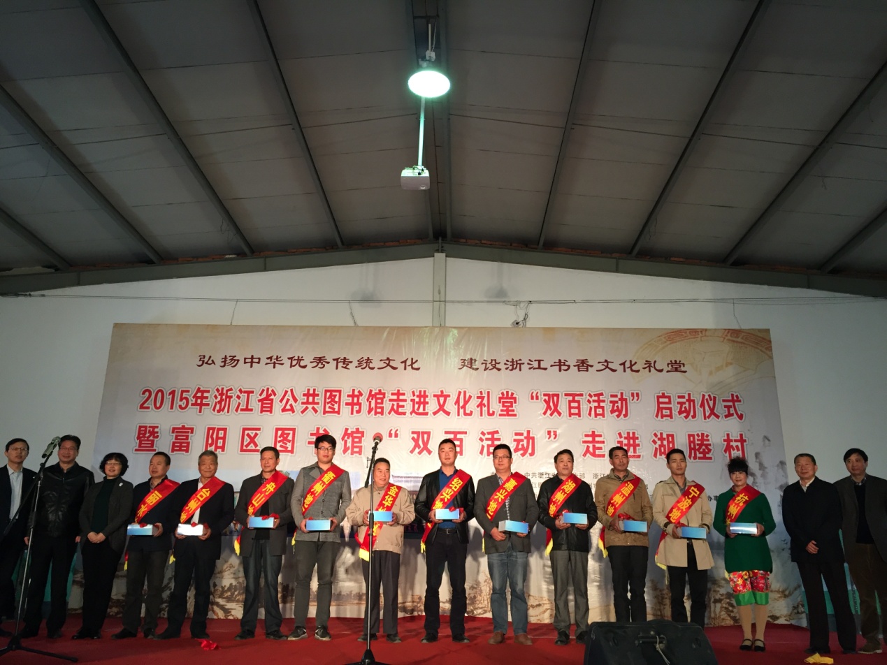 为充分发挥公共图书馆的文化服务功能,为全省农村文化礼堂提供公共图书馆的服务,2015年11月11日全省98家公共图书馆联合行动,在全省100家农村文化礼堂同时举行双百活动——百名馆长走进农村文化礼堂为农民群众现场讲解百场展览活动。