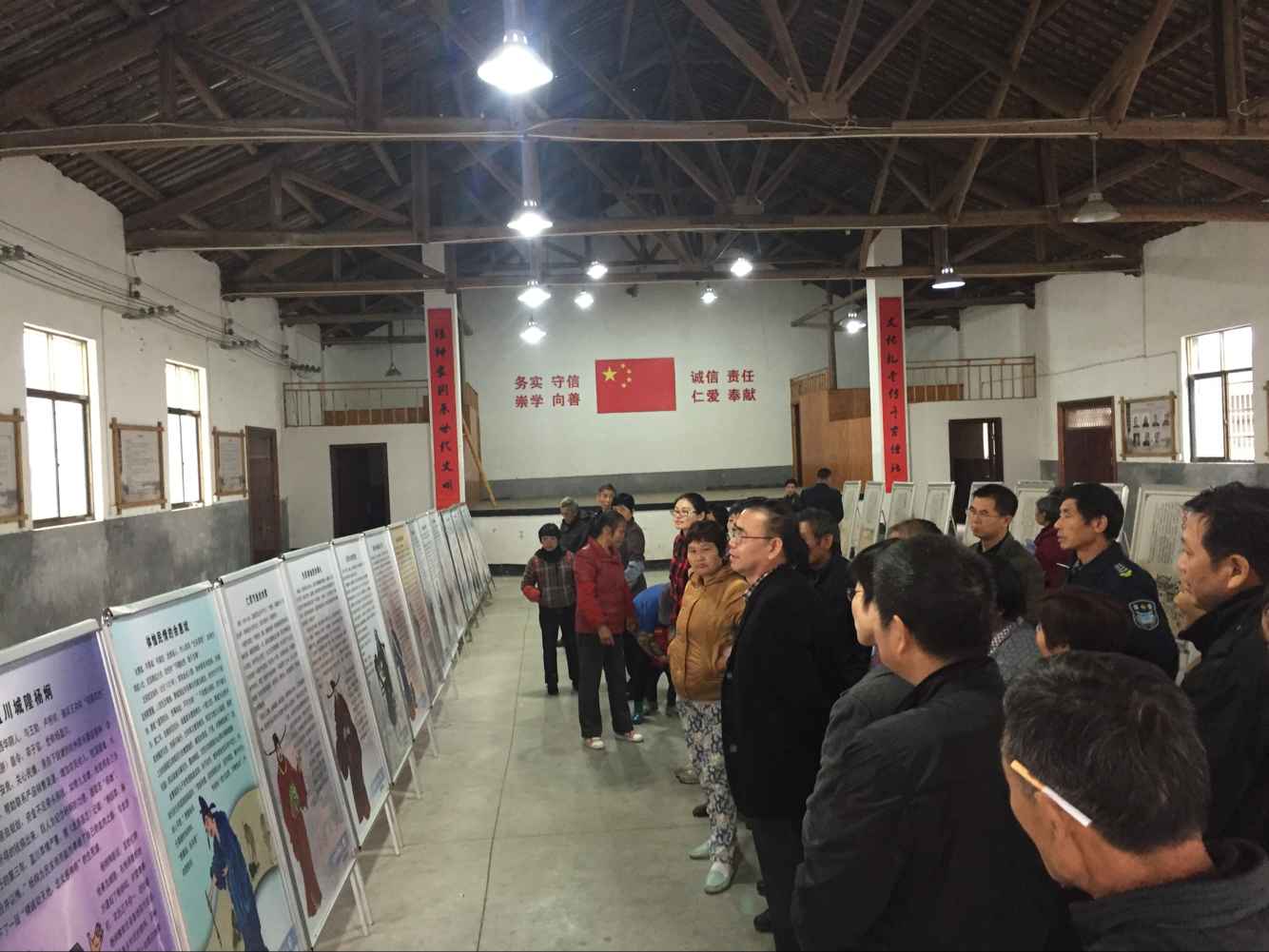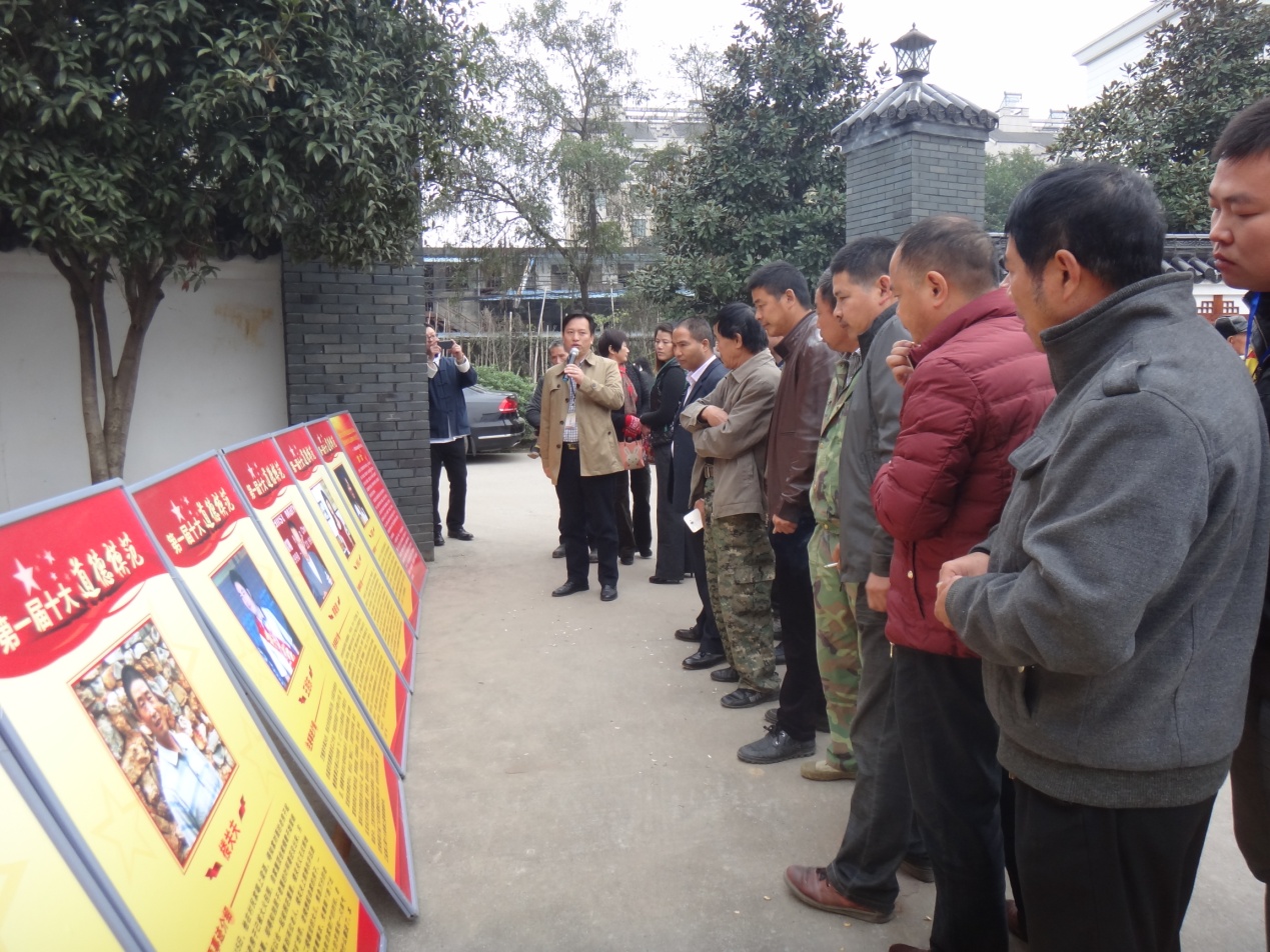 富阳湖塍村文化礼堂*富阳区图书馆馆长王强现场讲解展览《道德模范事迹》。