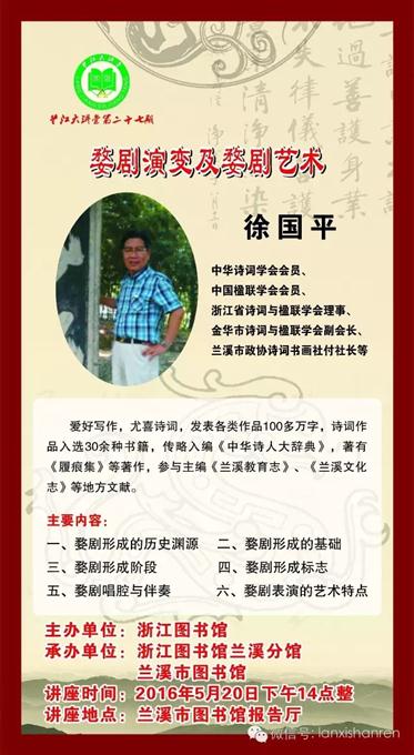 婺剧俗称金华戏,是极具浙江地方特色的剧种之一。婺剧从孕育走向成熟,经历了近400年发展衍变,是明、清流传于金衢地区戏曲竞争融合作用下的成果。婺剧作为一个古老剧种,在历经兴衰交替之后,仍凭借其独特的魅力,传承着浙江戏曲文化。5月20日下午,浙江图书馆邀请了中华诗词学会的徐国平老师来讲述婺剧的发展历程及其特点,带读者感受下婺剧这一具有浓郁民族特色的艺术剧种。
