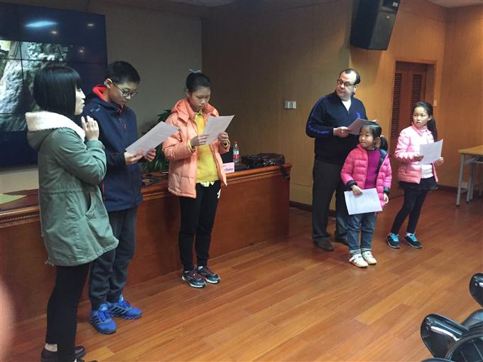 本次活动主讲是毕业于纽约州立大学的Kurt Shelton老师,他在戏剧表面方面具有丰富的教学经验。活动一开始,他先让孩子们进行热身,看一段影片,让大家模仿巨人不同的情感。接着,Kurt老师利用曲线图讲解故事发展的过程情节,让孩子们了解整个故事,以便更好地投入角色扮演。
