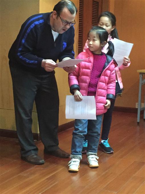 互动环节,Kurt老师带着孩子们朗读完剧本后,用丰富的肢体语言和表情教孩子们进行表演。开始还略带害羞的孩子们,在他的感染下,不由自主放松心情,一起完成了剧本表演。