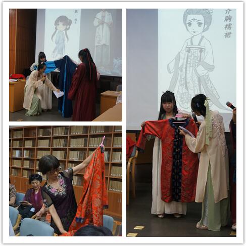其实《诗经》的内容立足于社会现实生活,多是对时政世风、战争徭役、婚姻爱情的叙写。在描写男女情感方面除了《关雎》之外,还有《子衿》。接下来,阅读推广人仿照古音,吟诵了《子衿》、《蓼莪》和《鹿鸣》,并带来了几套汉服让每一位视障者触摸,感受汉服的形制,了解古代的衣冠制度。