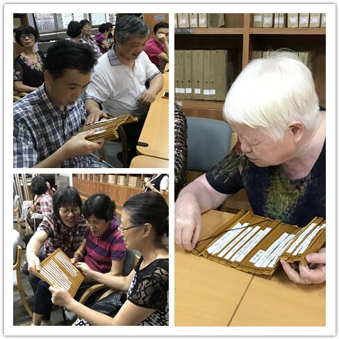 在欣赏完阅读推广人的吟诵后,在座的视障读者对《诗经》的承载工具非常感兴趣。于是阅读推广人将事先准备的竹简分发给各人,视障者摸着用丝绳串编成的狭长的竹片,异常兴奋,“原来古代人读的书是这样的啊!”