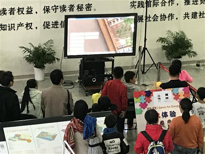 10月15日秋雨菲菲,可当你走进浙图,就会被头戴VR头盔、沉浸在虚拟现实中的读者吸引。他们不时地发出各种惊叹声,让过往行人驻足。这是浙图开展的第10场“游戏·改变G4C”系列活动之一:VR生活体验。短短两小时有30位读者体验了虚拟现实。体验者中除了年轻人和小学生外,还有迟暮老人,因为科技永远不会拒绝老人。在体验活动中我们专为老人提供了深海探索项目。当老人戴上VR眼镜,跟随工作人员的指导,便可“潜入”大海深处,欣赏各种深海鱼类,更能近距离的“触碰”到鲸鱼。当你站在深海的沉船中,一条巨大的须鲸发出低鸣从你的身边慢慢游过。那时你会感觉自己和大海融为一体,就像一条小鱼在船中穿行。当然孩子们的最爱是切西瓜。当他们挥动手柄,就像一位小武士,西瓜——10分、柠檬——2分、好一个连击增加读秒时间。每个孩子都在尽情挥洒,为谁是记录创造者一争高下。爱寻求刺激的年轻人,是不会放过坐过山车和高空坠楼的感觉。