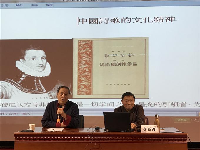 在通过对外国一些诗人及其作品的分析之后,现场观众也对其有所了解后,龚鹏程教授开始分析中国的诗。中国的诗是一个整体,而西方诗其实不是“一种艺术”,很难统一。因此,历来皆是基本上是分体论诗,而且叙事诗、悲剧跟小说和喜剧永远纠缠不清。还有,中西方的诗的兴致不同,中国人说诗言志,感物而动,而西方人虽也有情感,但没有感应的思想。因此中西方在诗上面是有很大区别的。