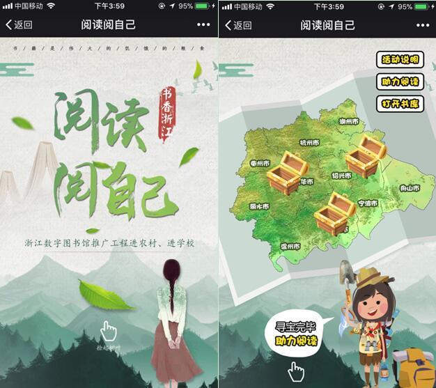 12月5 日,浙江图书馆“阅读,阅自己”线上H5互动正式上线。该H5游戏是浙江图书馆为数字图书馆工程进农村、进学校的推广打造的一次线上互动,用户每天有三次开宝箱的机会,可获得微信现金红包和免费电子书阅读体验的奖励,并可点击“助力阅读”按键为所在地市的全民阅读助力。浙图希望通过轻松有趣的互动,号召全省人民投入阅读、热爱阅读、助力阅读,同时用户也可点击“21天阅读”,进入“21天阅读计划”的全民阅读推广活动。