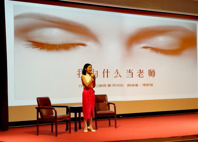 每一位来到舞台上的朗读者首先都分享了他或她朗读背后的故事。胡瑞美,温州大学教师教育学院的一位退休教师,国家级普通话水平测试员,可以说桃李满天下,带出了无数活跃在一线播音主持岗位的学生,但是今天她和我们分享的是她和她的视障学生的故事。张芳芳,浙江经视的主持人,曾经支教去山区,她带给那些留守儿童美好的诗歌必将给这些孩子的心底播撒下一颗柔软的种子。而学军中学的孩子们则以鲁迅课本剧来致敬这位教育先行者,鲁迅先生所倡导的“尊个性而张精神”、“以孩子为本”,在当下仍是非常重要的教育理念。一个个鲜活的人物,一篇篇温情却不失哲思的文字,让在场的每一位听众都深深为之动容。不管是仍在校园里的,还是离开校园许久的听众,在这个秋日的午后,被文字中的力量所感染,大家纷纷表示,生活中太需要这样一种仪式感了。
