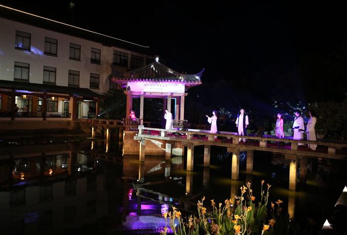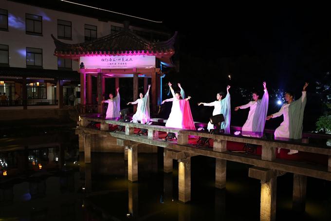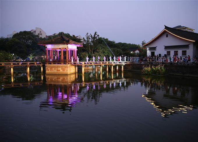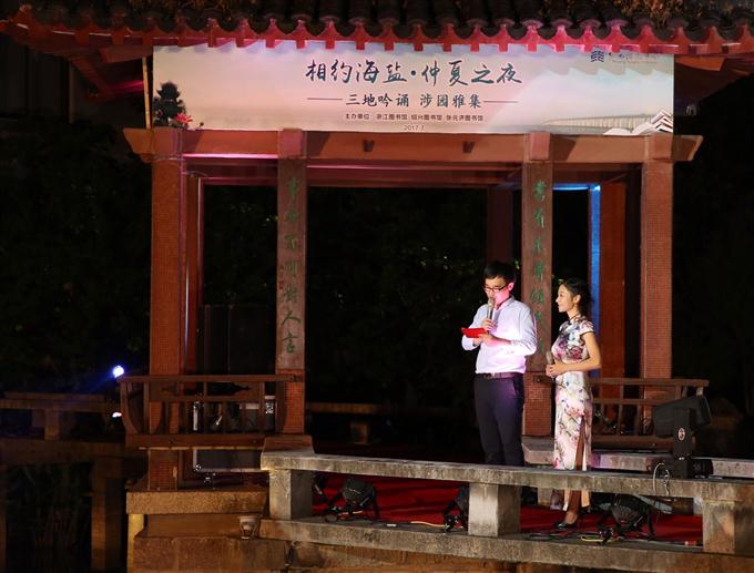 7月22日晚上,浙江图书馆、绍兴图书馆、张元济图书馆三馆联动,一起汇聚在张元济图书馆涉园,以园林风格的天然庭院为背景,以曲桥为舞台,在莲花盛开的水池上、读书亭边为海盐市民带来一场“相约海盐•仲夏之夜”主题朗诵会。