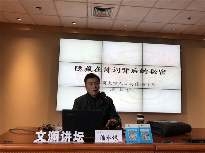 潘教授从联合国选取李白的代表作《静夜思》作为汉语诗歌入选世界诗歌日系列邮票引入本次讲座所介绍的诗人李白及他的作品。原来我们现在所知道的李白诗词都是从最常见也是最权威的王琦辑注的《李太白全集》而来。潘教授挑选了李白的《长相思》之三(美人在时花满堂,美人去后花馀床。床中绣被卷不寝,至今三载闻余香。香亦竟不灭,人亦竟不来。相思黄叶落,白露湿青苔)和《寄远》之七(妾在舂陵东,君居汉江岛。一日望花光,往来成白道。一为云雨别,此地生秋草。秋草秋蛾飞,相思愁落晖。何由一相见,灭烛解罗衣),一字一句地为读者们解释分析,从中发现表达了诗人对离人的思念之情。以为会像其他学者一样,按先挑选诗人作品再分析诗人想表达的内容及情感的“套路”让读者们深刻认识李白及他的作品,但潘教授却从这两首诗歌背后阐述了自己独到的见解,他认为这两个作品并非出自李白之手!随后他又从李商隐的作品《无题》(白道萦回入暮霞,斑骓嘶断七香车。春风自共何人笑,枉破阳城十万家)和安史之乱的历史来证实自己的观点。这不仅让读者们重新认识李白的作品,也给他们带了一次认知挑战。最后潘教授又回到开头,给读者们抛出一个疑问:《静夜思》的作者到底是不是李白。