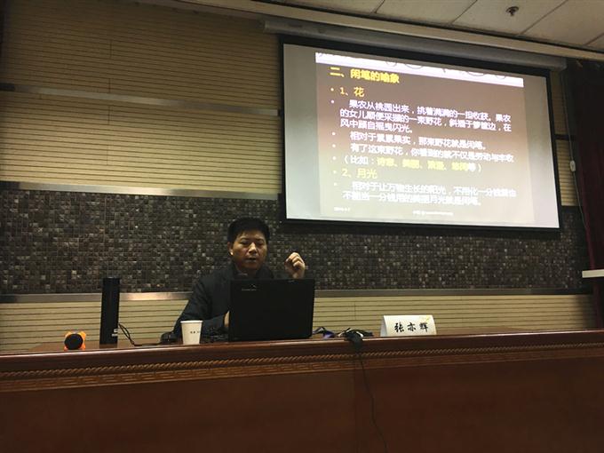 主持人简单开场后,正式进入张亦辉老师的分享。何为“闲笔”?张亦辉老师首先通过周作人对“文生情”的偏爱,讲述了一种对语言的把玩与赏享态度和对语言本身的情感与痴迷。闲笔可喻象于花、月光等,或浪漫或悠闲,或美丽而富有诗意。“某种意义上说,周末来听一个文学讲座,也是我们各自生活中的一个闲笔”。接着,老师又介绍了闲笔与中国文化,孔子“曲肱而枕之”,曾点“浴乎沂咏而归”,“悠然见南山”与山为友,“感时花溅泪”与花交心……中国人从古到今不乏有享受悠闲和从容之人。现代人也应该去享受闲暇,偶尔留下闲笔,自娱,也可众乐。