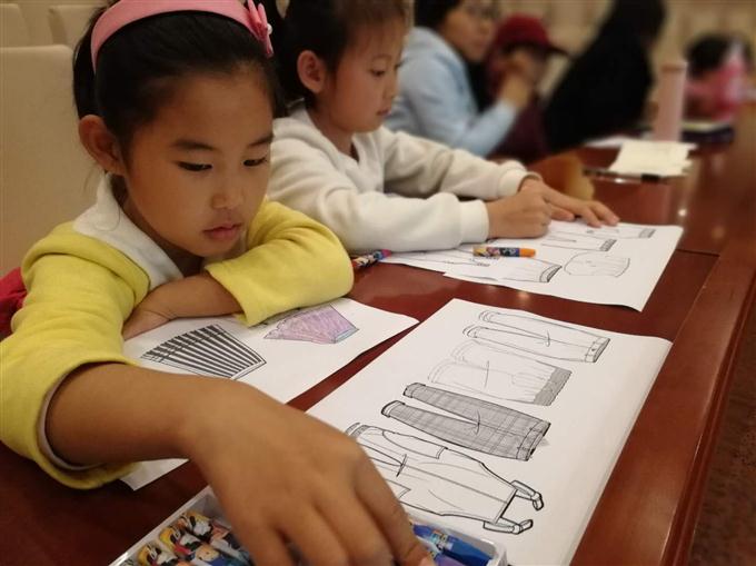 第一部分:柴老师分别从色彩、图案、材质三个方面入手。色彩方面选取了三种流行元素进行举例:贴近大自然的旅行者元素、展现个性更具潮流感的时代元素、展现活力的运动风。柴老师通过丰富多彩的服装图片,对儿童服装的创意设计进行了解说。小朋友们看得目不转睛,时不时还会主动分享自己感兴趣的图案如小鸟、蝴蝶结、水果。现场柴老师让小朋友拿起彩笔在印有空白服装款式图上填充自己喜欢的颜色。最后柴老师告诉家长们,颜色的选择其实与小朋友们的各自性格是有一定关系的。