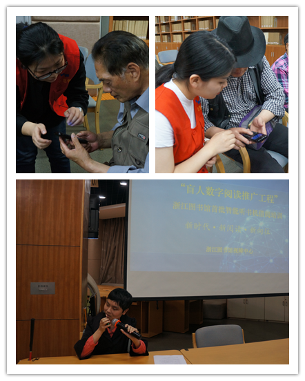 智能阅读听书机免费借阅,由视障志愿者孙雯及志愿者对读者进行操作培训
