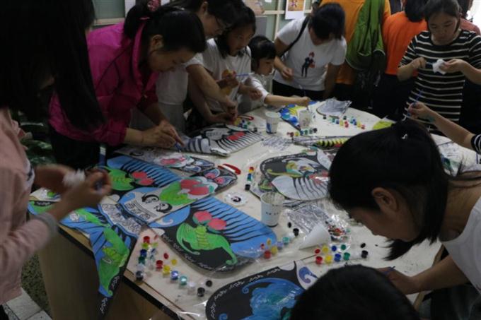 还有二楼回廊上的传统工艺品绘制体验活动,孩子和家长们跟着书画老师在绢丝团扇上绘画缥缈俊逸的中国传统水墨画、活灵活现的卡通人物等,或自己亲手制作纸鸢并填上缤纷色彩。