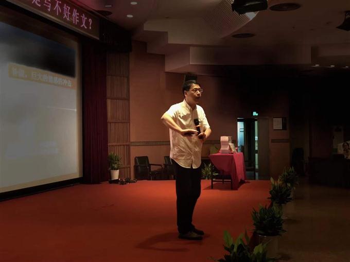 在讲座开始之前,陆陆续续就有家长牵着孩子们的小手就坐,想要陪伴孩子一起进步。讲座暖场时,张祖庆老师首先介绍了他的写作团队以及序言的作者,对他们的支持表示感谢。一位老师提到,现在的孩子们要学会在互动中交流,这样才能在作文中体现活力、让其富有灵气,在热闹的气氛中,正式进入了今天的主题——如何写好作文。
