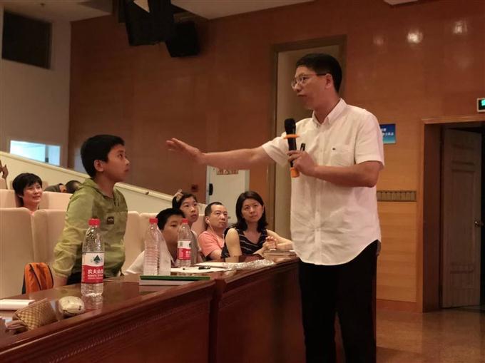 张祖庆老师是儿童阅读方面的领军人物,他十分清楚如何才能更快地吸引孩子们的注意力,他用两段微电影以及两则幽默风趣的小故事引出了新的知识点——突转。所谓突转,就是在故事叙述中不解释某些事件发生的原因,而是通过人物的感情和命运的变化来加强戏剧性的一种手法。老师认为电影是跨界艺术的典范,小朋友们要学会从电影中写作,从中学习一些特殊的表达手法和环境的描写并应用在自己的作文里,使其更富有色彩与感情。接下来为了和今天这个特殊的节日相呼应,张老师另外又放了一段关于母爱的微电影,母爱与父爱是世界上最伟大的感情,不求报酬,只求自己的孩子平安健康。接下来老师也介绍了自己的新书《童年不可错过的文学课》以及《光影中的创意写作》,在书中我们可以看到互动、协作以及家长陪伴学习的重要性。