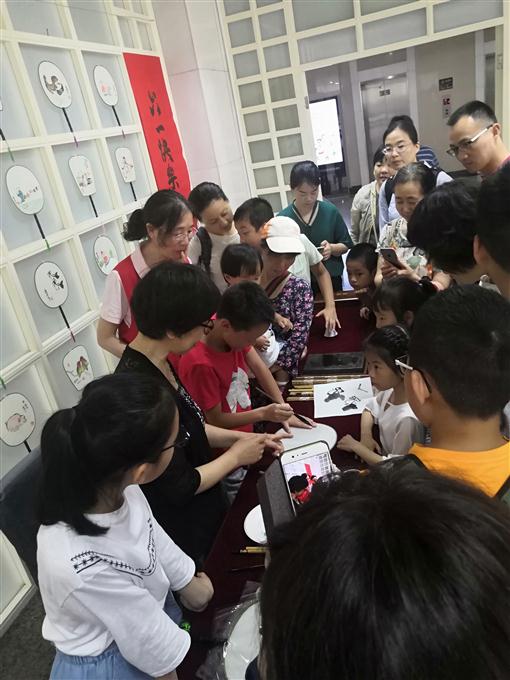 “六·一”节的下午,浙江省文史馆馆员、作家、画家汪逸芳和热爱书画艺术的小朋友们在一起,现场为孩子们画扇子。