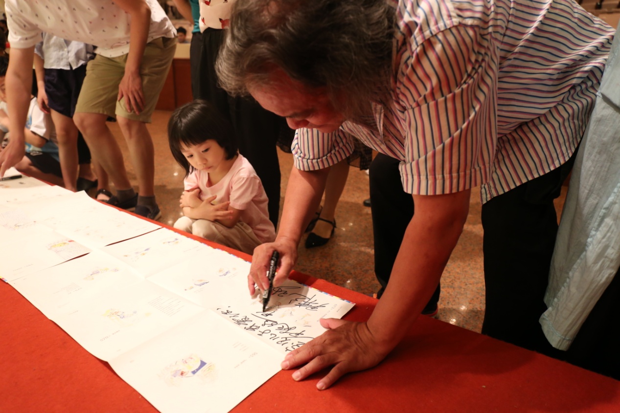 当主持人邀请读者上台朗读,“今天到图书馆,遇到这样好的活动觉得非常幸运”,上台参加阅读的爸爸们由衷感叹。主创和现场的爸爸们组成十人朗读者,共同朗读《1000天的爱》;现场参与者每个人都在《1000天的爱》手稿上写下了自己对于孩子的祝福,孩子也写下了对于爸爸妈妈的祝福。
