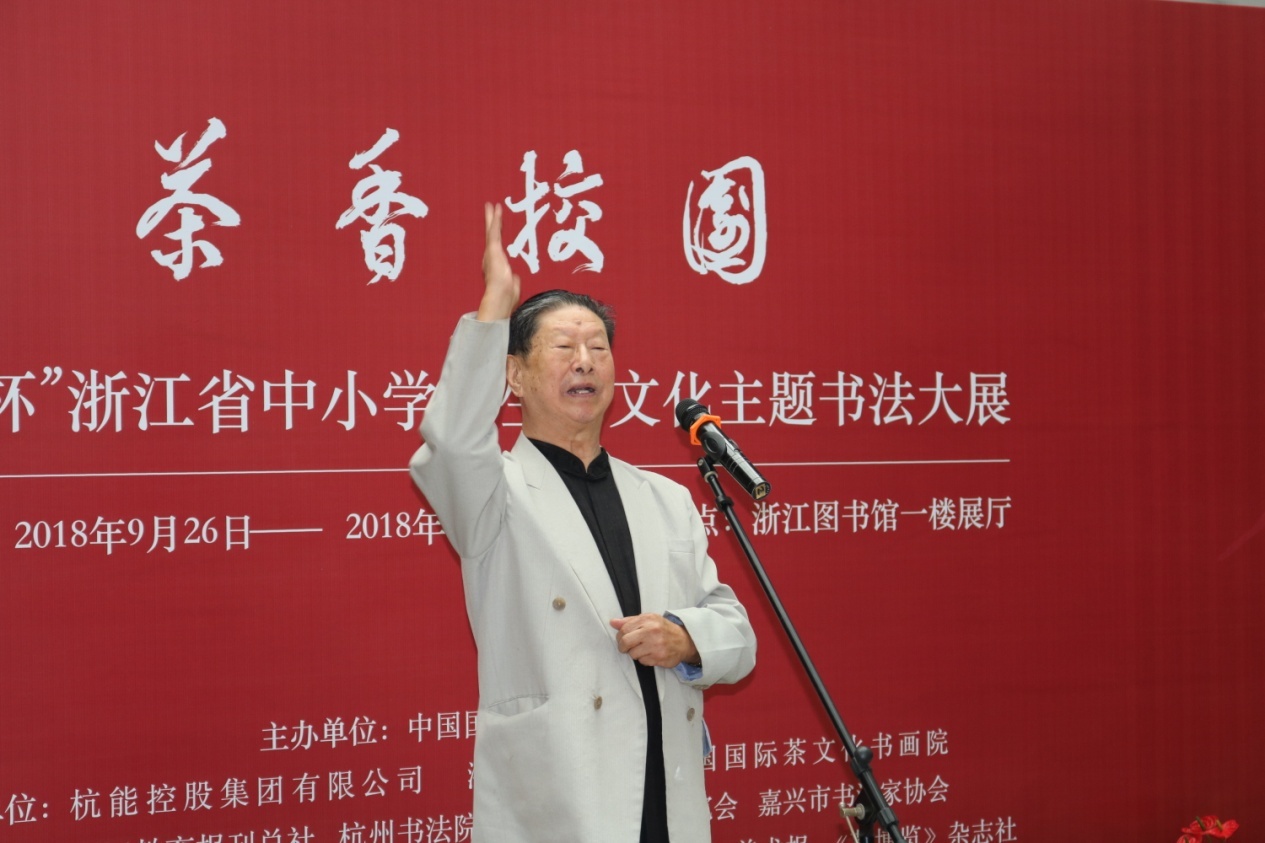 杭州市政协主席、中国国际茶文化研究会常务副会长孙忠焕为展览作序并致辞,他讲到数千年来,中国茶从中国走向世界,从过去走到现在,并要走向未来,靠的还是文化内涵的力量。中国茶文化就是中华民族优秀传统文化中的具体表现,中国书法艺术也是中华民族的优秀传统文化中的具体表现,书法其深厚的积淀,丰富的给养,滋润了中华文明,让中小学师生们用中国书法艺术的形式,书写中国茶、宣传中国茶、赞美中国茶,展示书法艺术、熏陶中国茶文化,这不仅是培养青少年们文化修养的好形式,也是弘扬“茶为国饮”、“以茶惠民”、“以文惠民”的好形式。