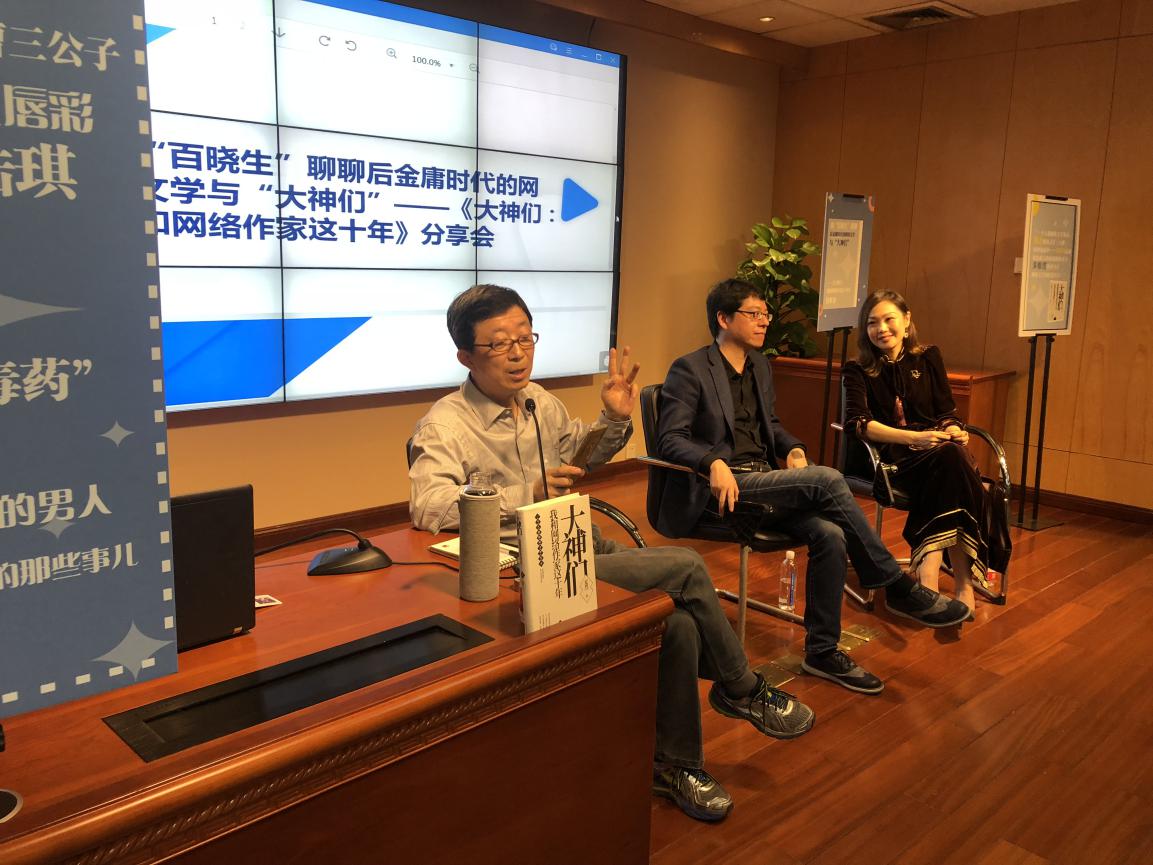 11月4日的“读书岛”分享会上,“读书岛”发起人、微信公众号“劳月夜聊”主笔劳月邀请了此次分享书目《大神们:我和网络作家这十年》的作者、杭州师范大学教授、浙江省网络作家协会常务副主席夏烈,杭州市作家协会秘书长、杭州市网络作家协会秘书长陈曼冬等人来到现场,与众人共同回忆金庸等人的一代武侠江湖,并结合金庸时代的历史来分析当下的网络文学发展,讲述后金庸时代的网络文学与网络大神。