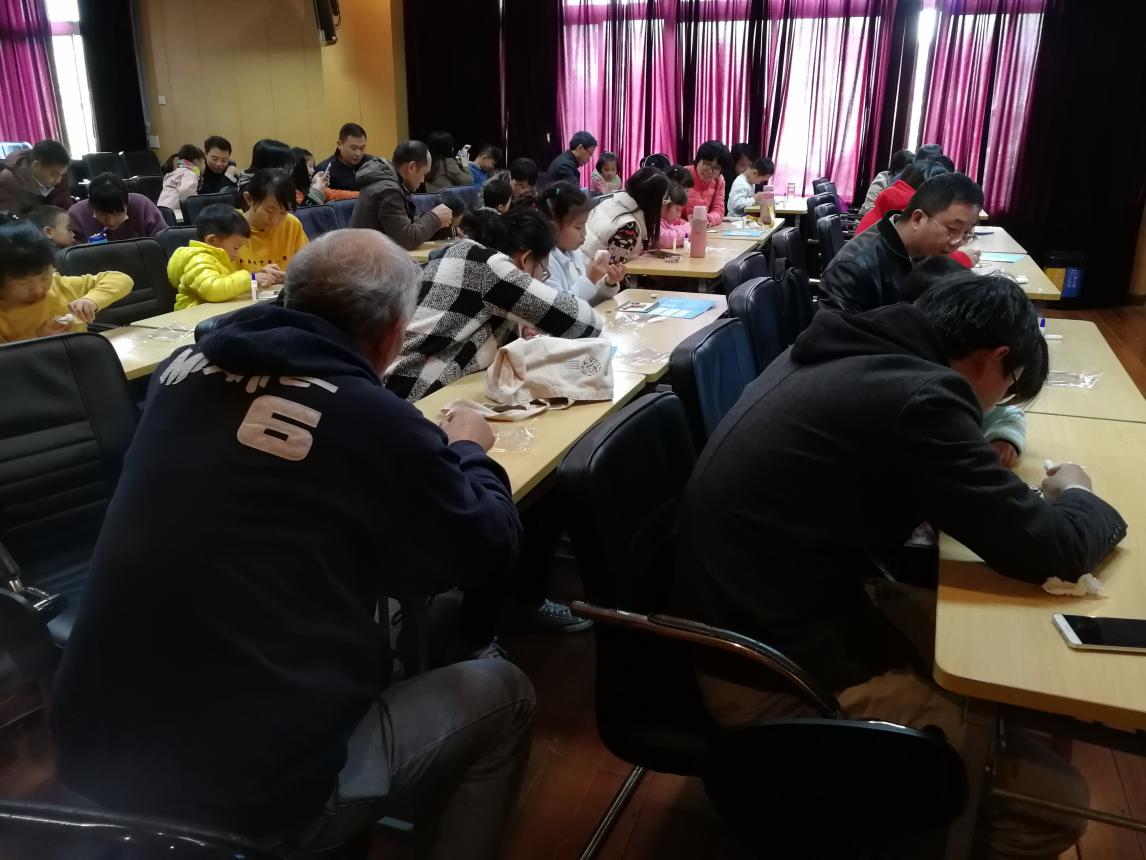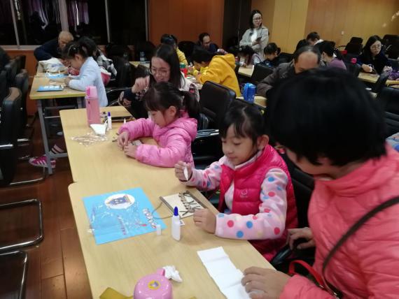 故事讲完了,接下来就是亲子活动—创意干树枝DIY。赵老师现场向每一位小朋友分发了创意枯树枝的制作材料,并现场进行了制作演示说明。小朋友们拿到材料后的便迫不及待地开始制作了,家长们在旁边为他们的小艺术家做帮手。不一会,同干树枝拼出来的小动物便栩栩如生的出现在拼图板上,小朋友们还用五颜六色的发光亮钻贴进行了装饰点缀。贴的不亦乐乎,玩的也不亦乐乎!