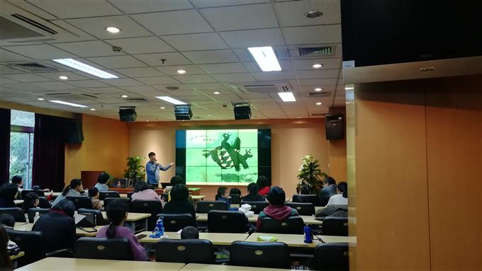 活动伊始,赵老师让小朋友们用他们的方式逐个做自我介绍并介绍自己的父母,小朋友们有的说自己喜欢吃冰淇淋,有的喜欢巧克力,有的小朋友对话筒充满了好奇,十分可爱。接下来老师让小朋友们根据给出的情境做出表演,吃到酸橘子、吃到辣椒、吃到巧克力......小朋友们开始时扭扭捏捏,但在老师和家长的鼓励下渐渐的释放自我。然后老师便开始讲故事了。老师娓娓道来,伴随着屏幕上彩色的画面,故事一点点的进行着。胆小的布鲁姆博士每周一喜欢和他的朋友一起去游泳,狐狸吓唬他们湖里有水怪,布鲁姆博士不敢下水,但最后为了救落水的金鱼朋友还是套上救生圈去救朋友。由于在水里看不清细节,带着许多救生圈的布鲁姆博士看起来就像怪物,吓坏了周遭的动物朋友们......