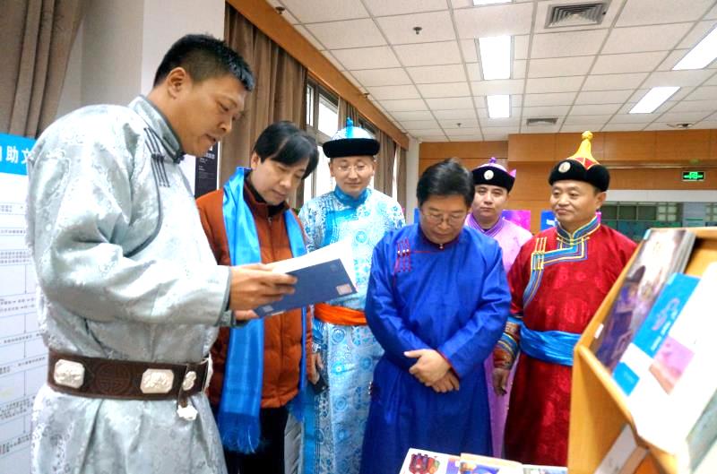 1月9日下午,浙江图书馆举行蒙古文图书专架开架暨赠书仪式,蒙古族学者、浙江长征职业技术学院副院长杜宝山,杭州市政协委员、杭州九三学社建筑支社副支委王景峰,浙江图书馆馆长褚树青出席,在浙江省工作、生活的蒙古族爱心人士,现场的读者朋友以及浙江图书馆工作人员五十余人参加仪式。