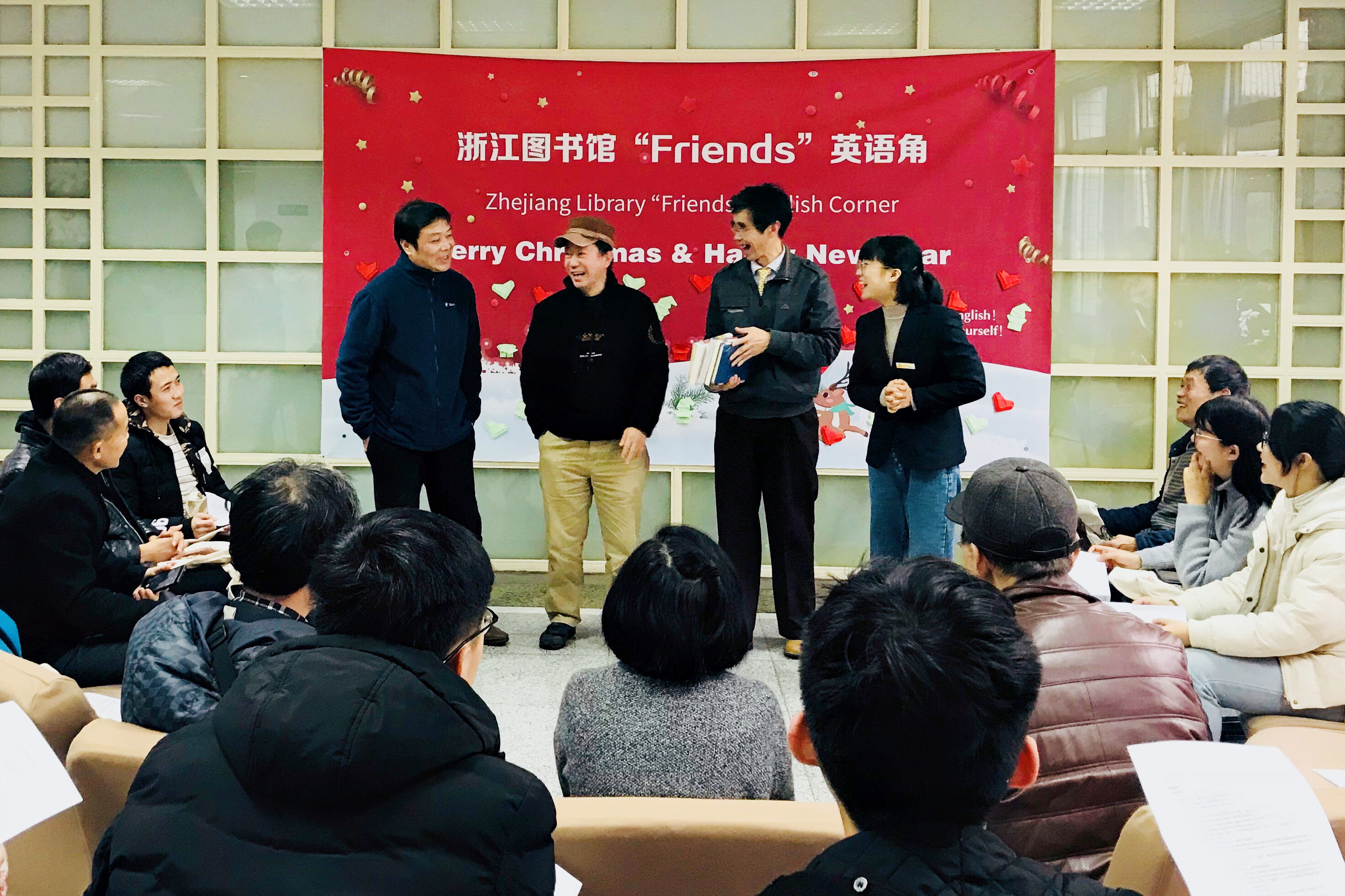 2018年12月22日下午2:00,浙图“Friends”英语角在二楼回廊如期举行。本期主题是“Christmas Party”。活动一开始,“圣诞老人”就给现场三十多位读者送来了小惊喜,并且被评选出的五位“Friends”英语角“年度之星”也收获了自己喜爱的图书。