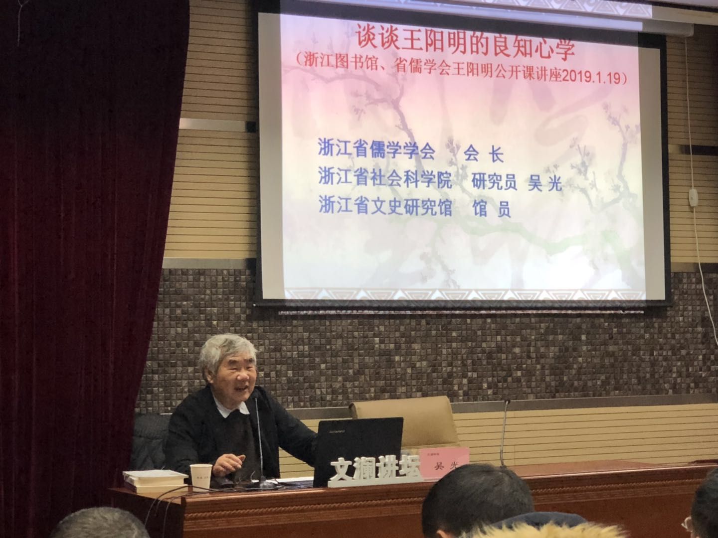 2019年1月19日下午,文澜讲坛邀请到浙江省儒学学会会长、省社会科学院哲学研究所研究员吴光老师做“谈谈王阳明的良知心学”的讲座。这也是讲坛与省儒学学会合作新开系列“王阳明公开课”的第一讲。腊月的杭城寒风瑟瑟,而文澜厅却春意盎然,厅内座无虚席,更有一、二十人全程站着聆听。