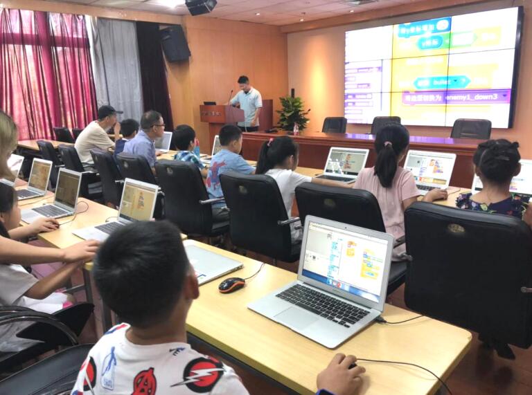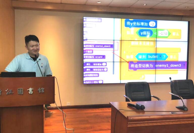 2019年7月21日上午十点,由浙江图书馆与小码教育联合主办的Scratch趣味少儿编程,如期举行。本次编程内容是飞机大战,对于爱玩游戏的人应该不会陌生,这是一款很火的小游戏。本期由小码教育的于海泉老师担任主讲人。