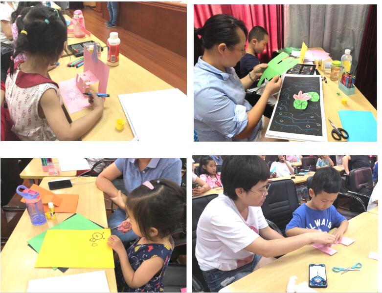 2019年7月21日(周日)下午两点,【知造屋】亲子阅读又热闹了起来!由浙江图书馆和一果儿童创意美学联合主办的儿童绘本设计与制作,在浙图二楼集体视听室如期进行。本期主讲老师陈叶霞,一果儿童原创绘本研发导师。本期活动的主要内容是让小朋友们动手学做绘本,通过剪纸绘画来制作一个立体的荷塘趣事。