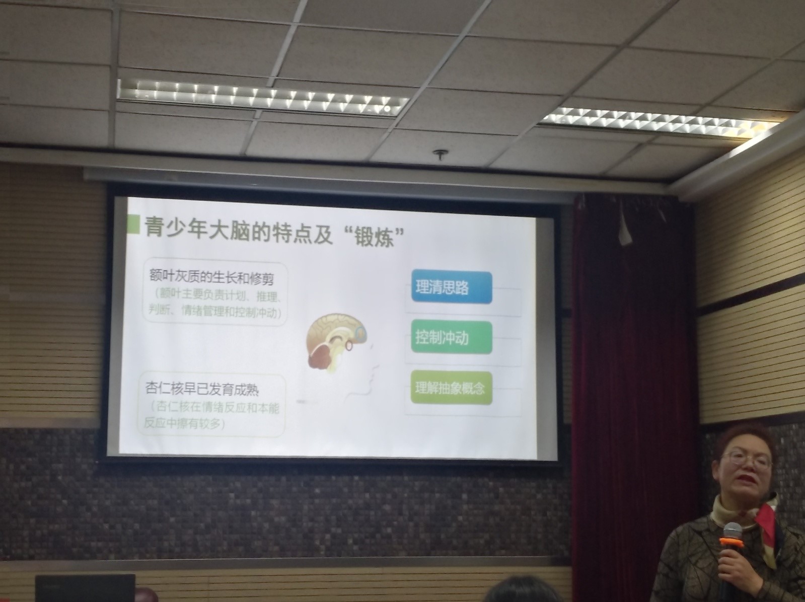 接着,她介绍了青少年大脑的特点及“锻炼”:额叶主要负责计划、推理、判断、情绪管理和控制冲动,杏仁核在情绪反应和本能反应中较多;她指出青少年思维的特点是:理想主义和批判性、爱争论、优柔寡断、言行不一、自我意识、独一无二and无懈可击,青春期叛逆的主要特征是:情绪焦躁不安、和家人冲突不断、疏远成人社会、行为鲁莽冲动、排斥成人价值观。并通过讲述小故事“叛逆边缘的韩寒”、“孔融让梨故事新解”,让家长们更加了解叛逆期的孩子的心理特点。