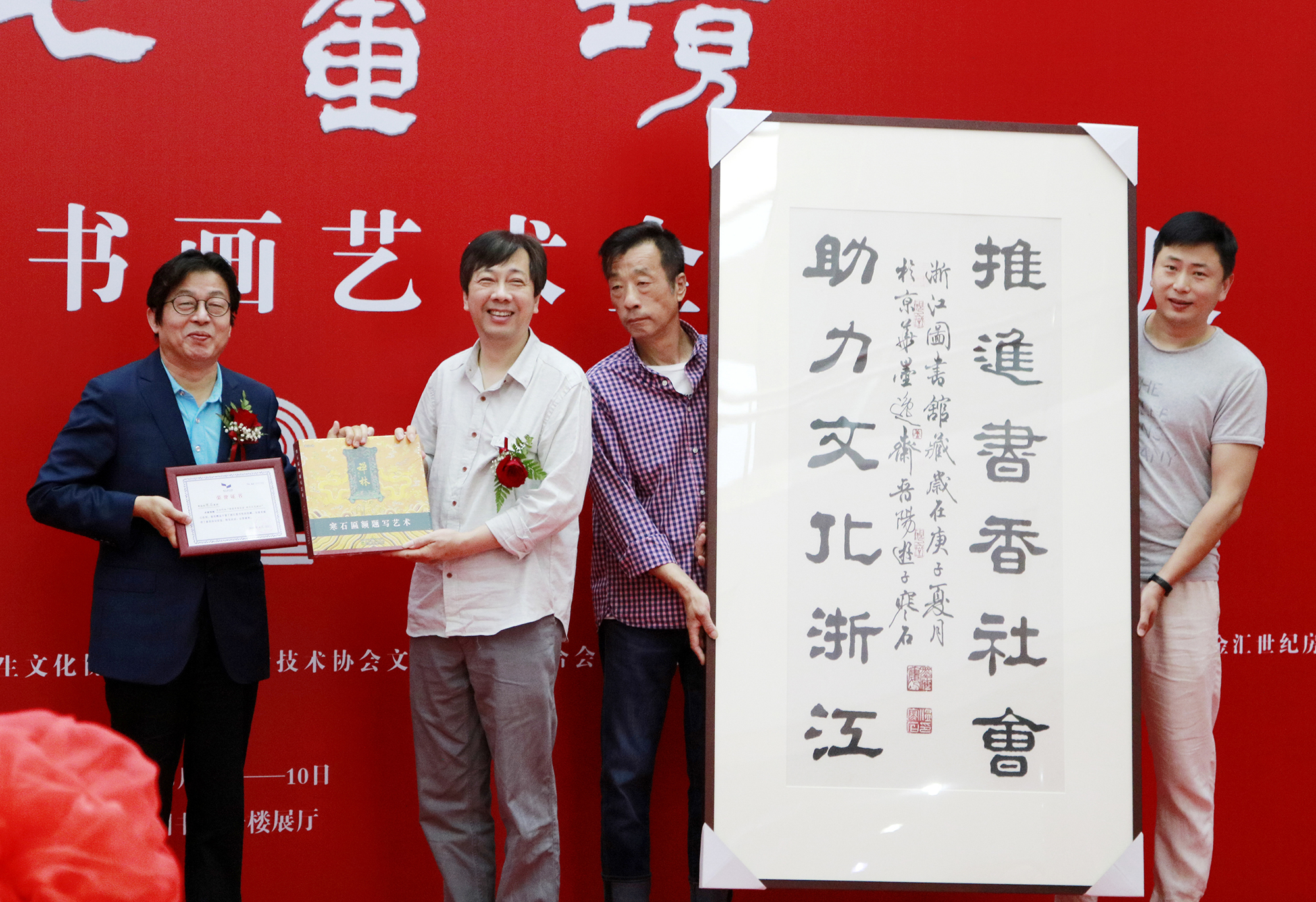 随后,寒石教授向浙江图书馆捐赠了专门创作的书法作品“推进书香社会 助力文化浙江”,以及最新出版的两册图书《文心画境》《禅林:寒石匾额题写艺术》,浙江图书馆褚树青馆长接收了捐赠并向寒石教授颁发了收藏证书。