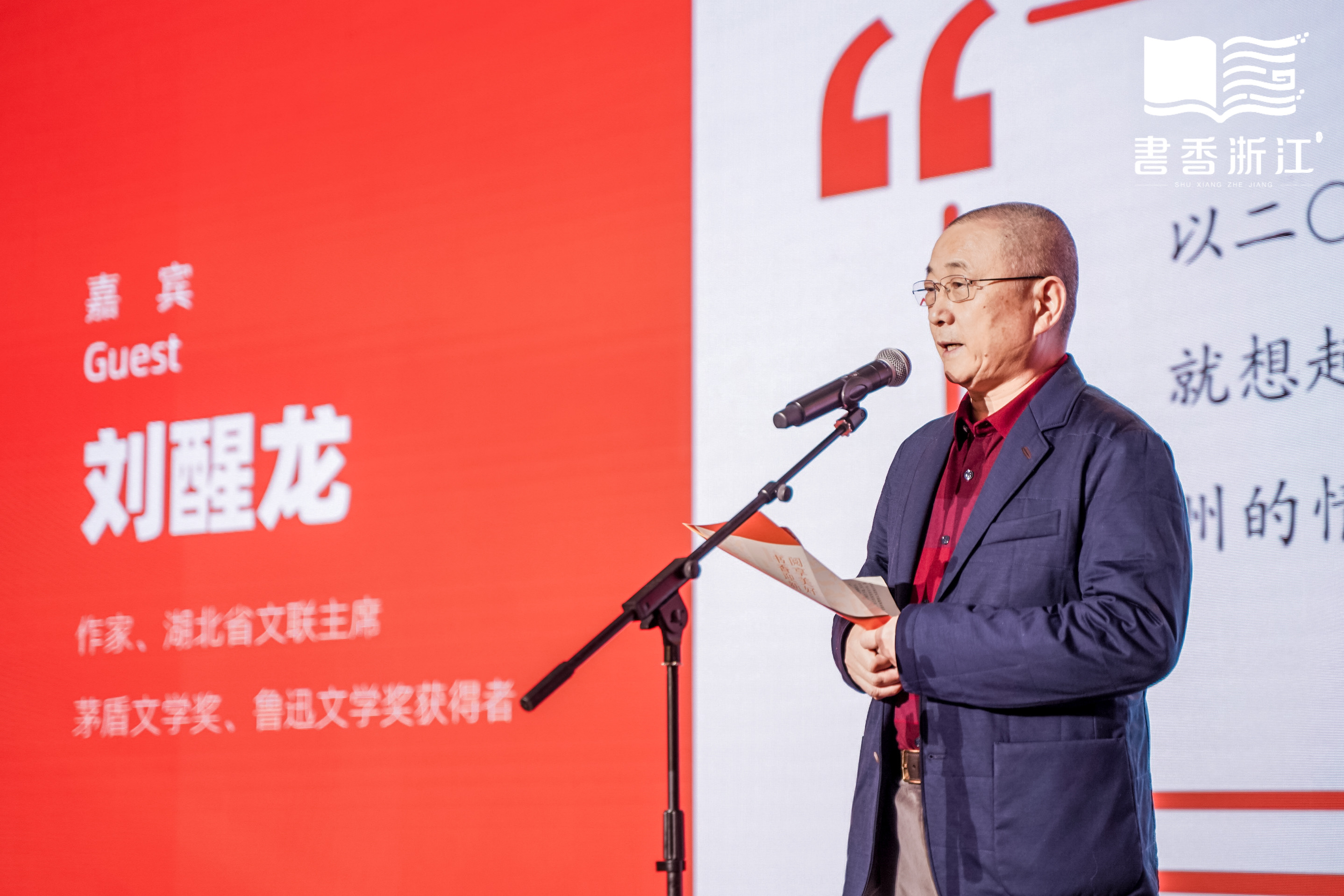 刘醒龙先生从武汉来,舞台上的他首先带来了湖北人民对浙江的感谢。他说,在武汉三镇新冠肺炎疫情最严重、最危险的时候,浙江派出两千一十八名优秀儿女驰援武汉,他带来了郑重的感谢。