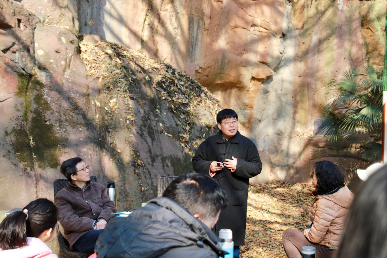 大佛寺遗址的守护人罗大为告诉我们,相传此处为秦始皇缆船石所在。北宋宣和年间,僧人将巨大的缆船石雕刻成弥勒佛半身像,并盖了寺庙,名大石佛院,民间称为大佛寺。大佛石像上面,就是当年苏东坡住过的十三间楼旧址。在这样一个能俯瞰西湖的地方来分享《苏东坡传》,实在再合适不过。和煦的阳光下,20多位书友静静地聆听着浙江图书馆古籍部主任陈谊讲述着他对《苏东坡传》的阅读体会。