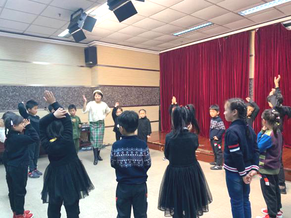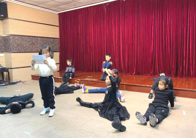 《野兽国》讲述的是小朋友阿奇在多年魔幻之旅后仍旧以从前的年龄回到家中,并感受到家的温暖的故事。由一位小朋友扮演主角阿奇,一位家长扮演阿奇妈妈,其他小朋友扮演家具、厨具和野兽,叶琪老师指导台词和布景。小朋友们在表演中既获得了自信,也提升了表演技能。特别是其中一个环节需要小朋友们扮演厨房中的各种厨具,有笔直地“筷子”、两腿盘起的“盘子”、双手前伸的“碗架”,有一个小朋友平躺在地上,很难想到他扮演的竟然是地毯。这样的即兴表演不仅极大发挥出了小朋友的想象力,而且也透露出观察生活的重要性。