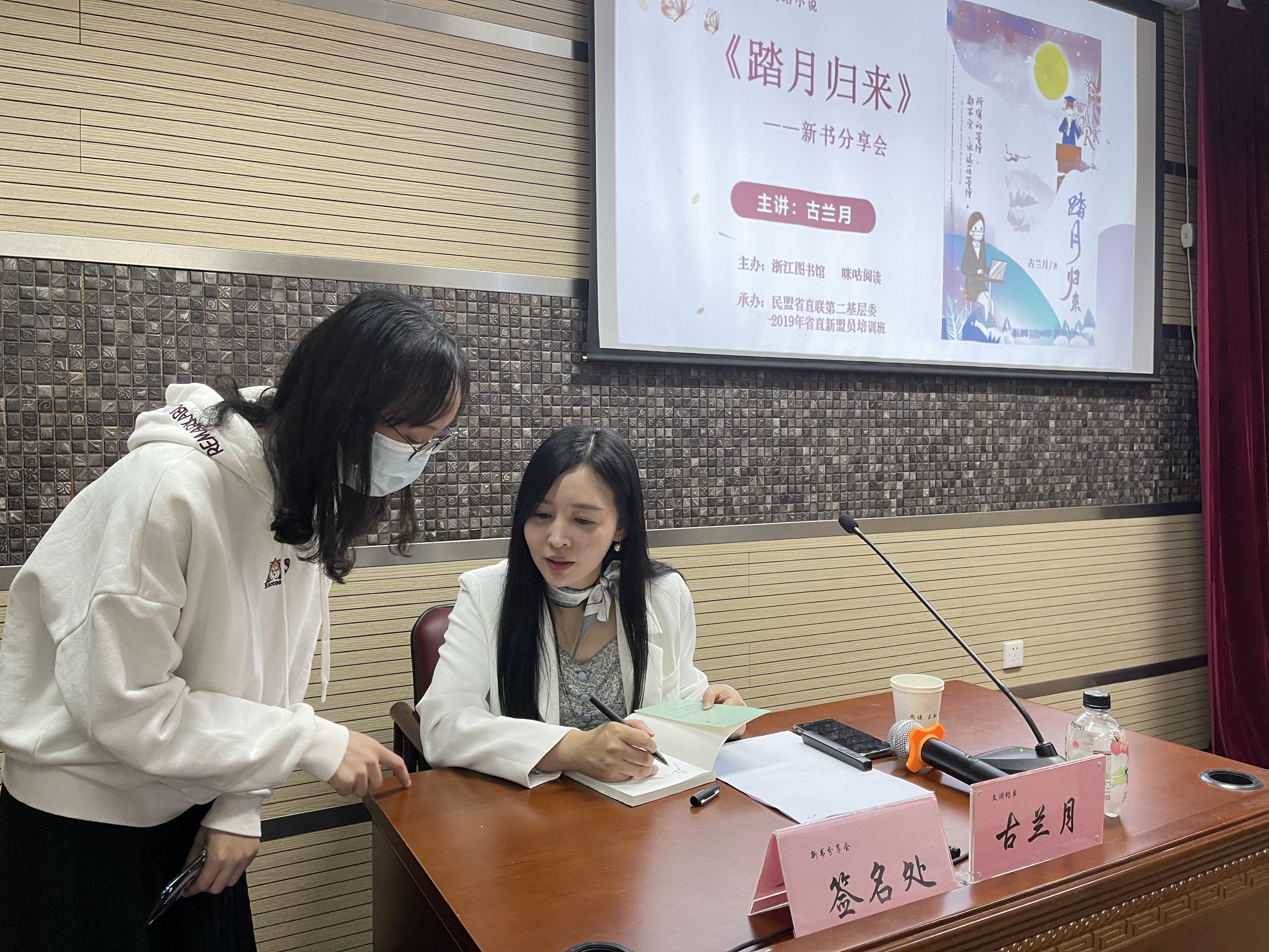 从第一本散文集《你不慌,世界不荒》到网络小说《踏月归来》,10年来,古兰月写诗、写散文、写童话、写小说,也写纪实作品,著有网络文学《青木微雪时》《木莲花开》等,长篇小说《龙井》《南方姑娘》,散文集《你不慌,世界不荒》等10余部作品。作品曾入选中国作协重点扶持项目,曾获浙江省五个一工程奖、冰心散文奖等。活动当天现场气氛十分活跃。在现场,古兰月向读者赠送了珍藏版签名散文集。