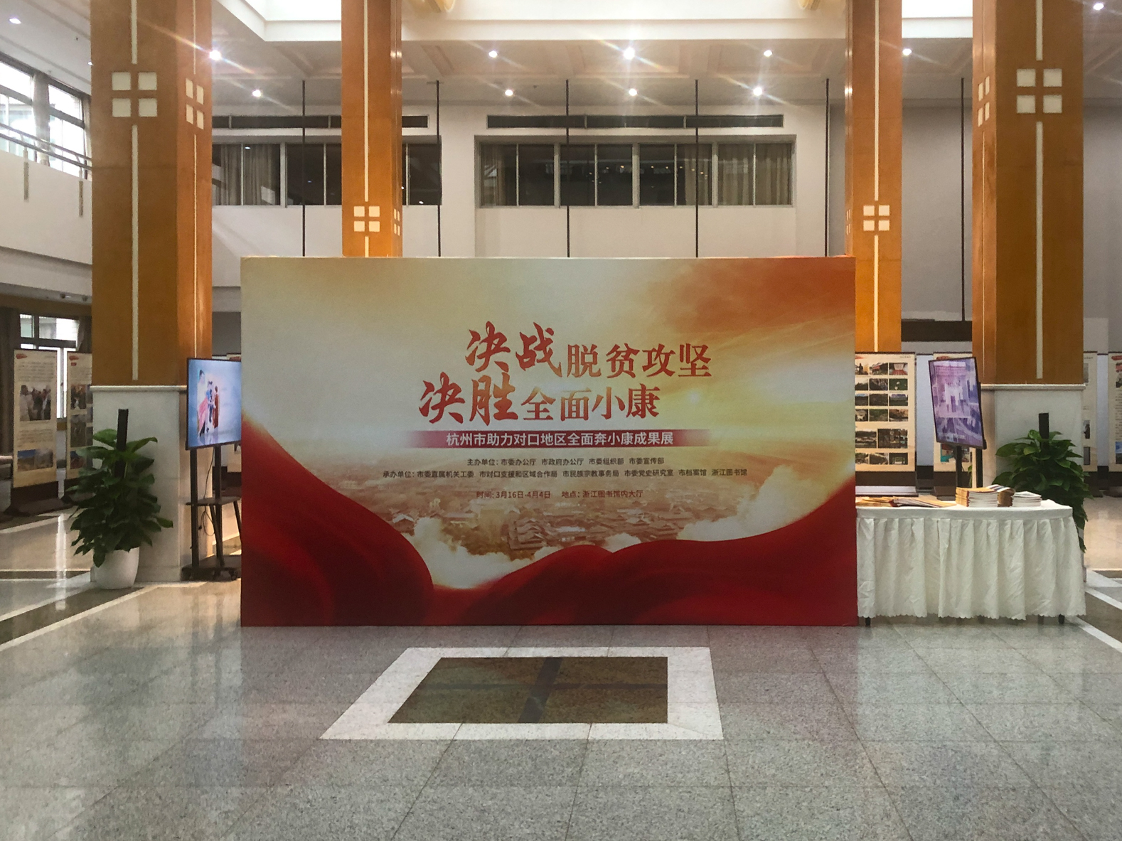 2021年3月16日至4月5日,“决战脱贫攻坚 决胜全面小康——杭州市助力对口地区全面奔小康成果展”在浙江图书馆内大厅展出,展览通过图文、视频等形式展示了杭州市对口脱贫攻坚工作所取得的成绩,吸引了广大党员、群众前来参观。