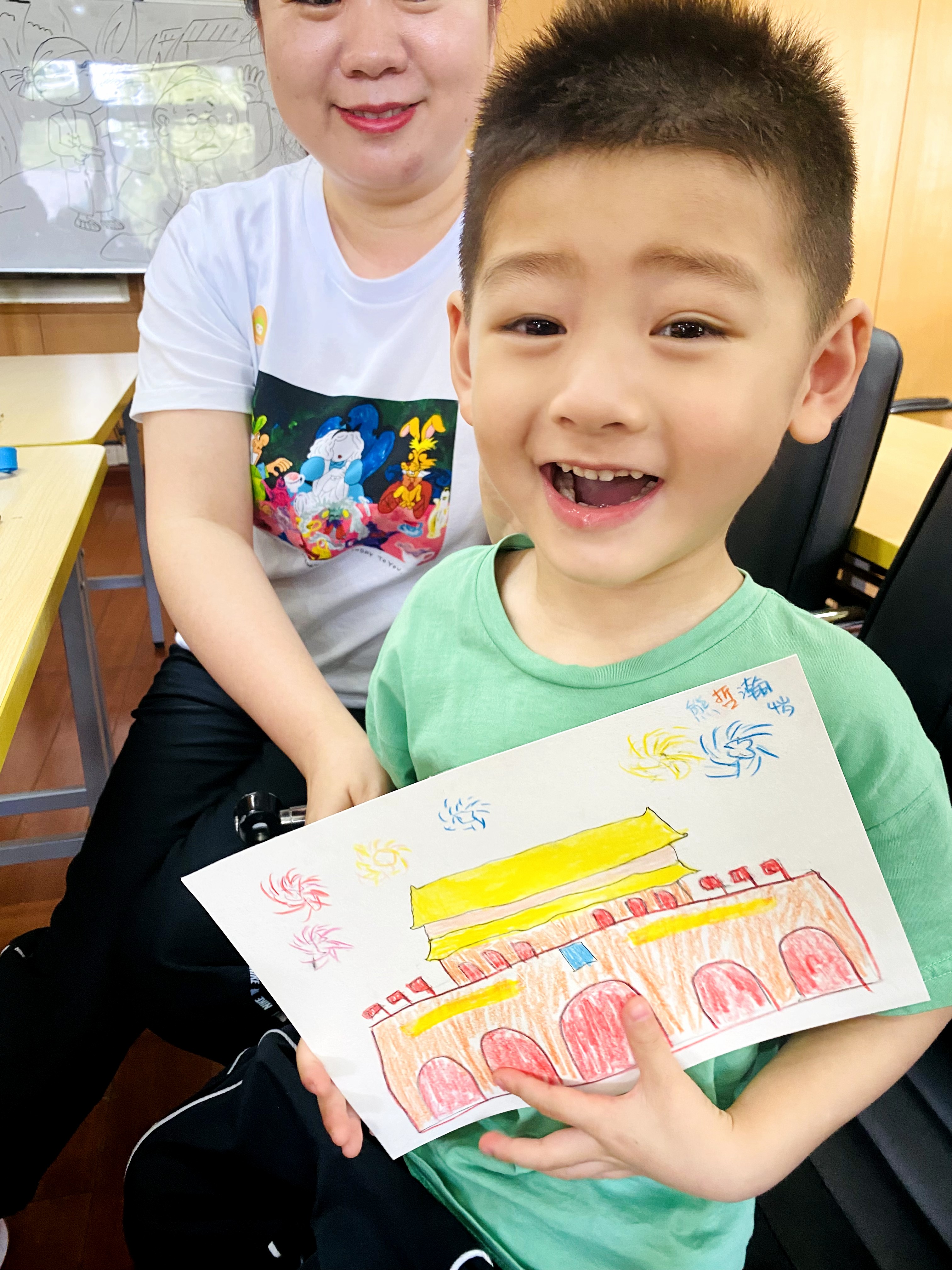 随后,就是小朋友们最喜爱的绘画环节了。老师播放绘画教学视频,并指导绘画时的注意事项。小朋友们拿起手中的画笔,跟着绘画教学,画出了天安门的城墙、城门、飘扬的红旗,还有在空中盛放的烟花。在绘画的过程中小朋友们认真聆听老师讲解绘画的技巧和使用文具的注意事项。经过了半小时左右的绘画,小朋友们都完成了自己的绘画作品,并且涂上了丰富多彩的颜色。这些绘画作品表达了孩子们对祖国的热爱与赞美,借由画笔来庆祝这个特殊的儿童节。