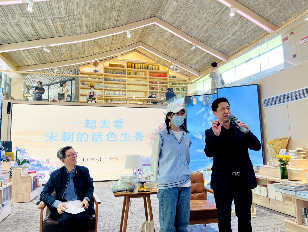 陈华胜老师分享了两个有趣的故事。一个是从南宋宰相周必大的故事看南宋人得谦和礼让;另一个是“中兴四大将”居首的张俊家老兵经商的故事看得出宋朝的国际贸易。分享会上,来自浙江图书馆文澜朗诵团的朗读者朗诵了苏轼、柳永、范仲淹、辛弃疾、陆游、李清照等人的宋词名作。