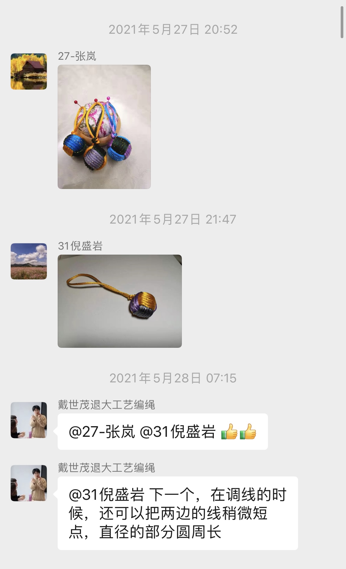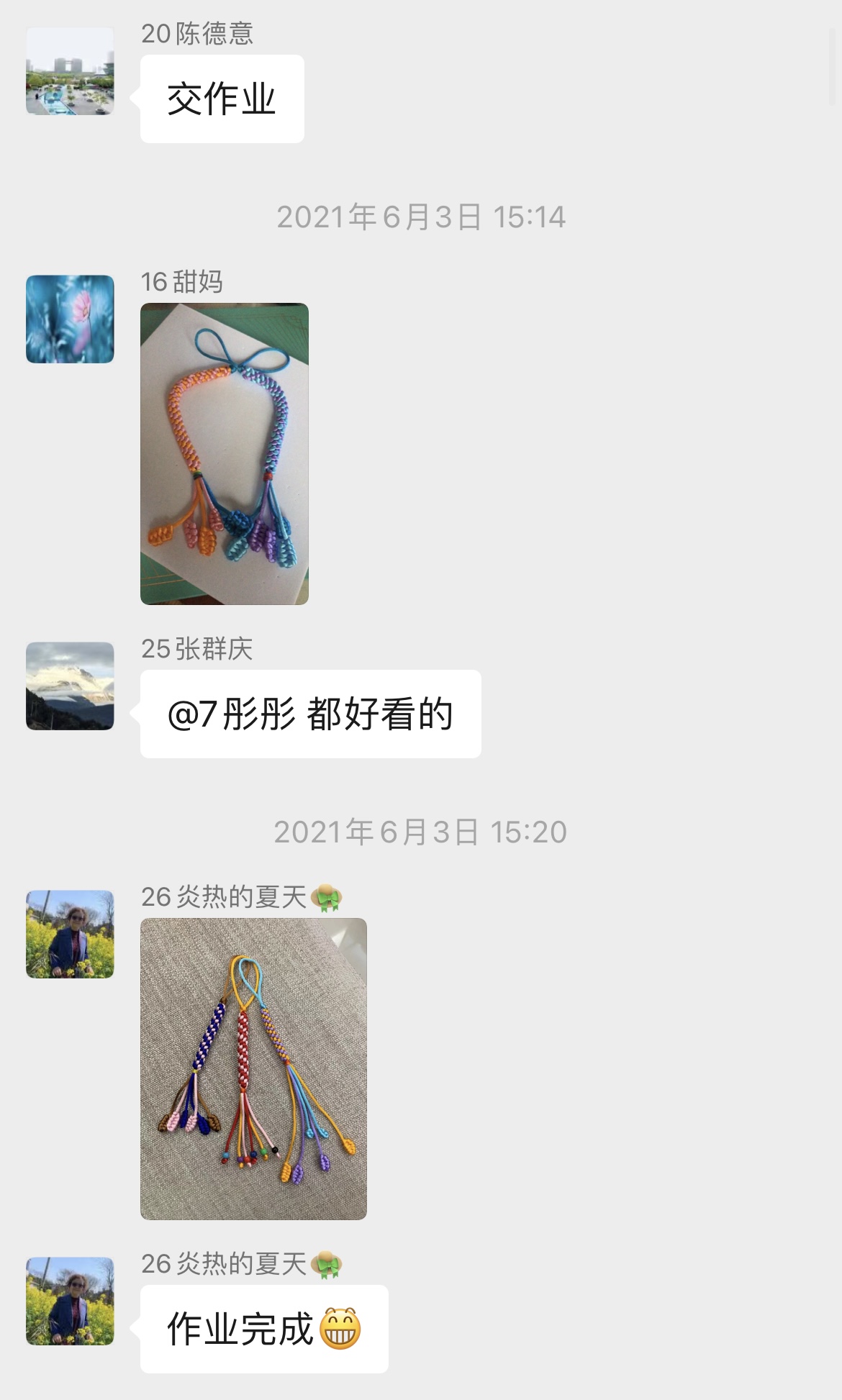 戴老师用通俗易懂的语言进行授课,将专业的编绳课变得不再单调,课堂气氛活跃。学员们好学好问,每次下课前都能将本次课堂作品完成。课后学员们还会在交流群分享完成的作品,戴老师在表扬的同时也会指出其中的不足之处及改进办法。