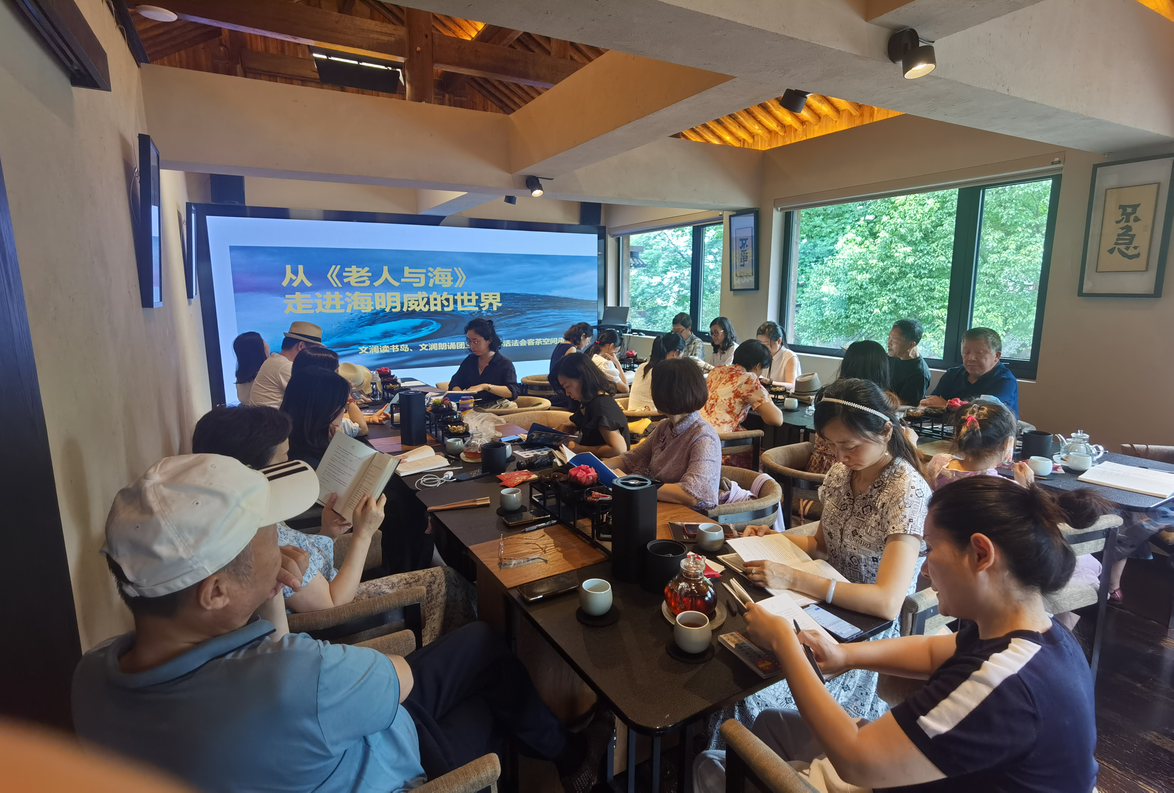 7月17日下午,在幽静的天竺路边的一杯活法会客茶空间,文澜读书岛举办《老人与海》接龙朗读会。朗读会开始,由活动发起人劳月老师赠送《老人与海》给今年刚完成高考的读者周嘉斐,希望她热爱朗诵和阅读的初心不改,祝福她用海明威在这本书里展现出来的精神和毅力,战胜学业上的困难。劳月老师先分享了自己对于这本书的阅读感受,海明威之所以值得我们铭记和阅读,是因为他不仅仅是一位伟大的作家,更是一位坚强的战士和硬汉。海明威作为战士、记者、猎人、渔夫的传奇经历,深刻地影响了他的作品,而这些作品又反过来塑造了他百折不挠、坚韧不屈的硬汉人格。《老人与海》正是海明威的代表作品,是海明威精神的最好写照。